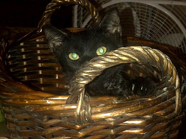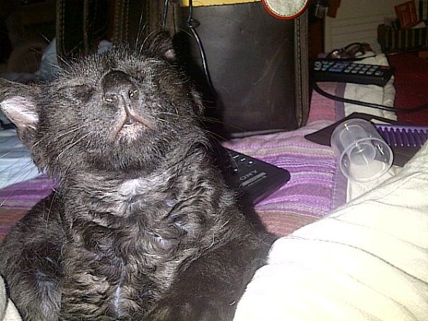 This cat made me laugh every day of her life, which sadly lasted only one year and ended yesterday, April 4, 2012. I held her as the vet injected the disturbingly pink fluid of euthanasia. Why? Because people don’t spay or neuter their animals and cats procreate like crazy and disease runs rampant. Then some unfortunate stray with Feline Leukemia Virus infected Phyllis despite her being vaccinated (it happens) during one of the many random turf wars fought by cats defending or gaining territory. Phyllis’ health has been a struggle for the past four months including infections, non-healing wounds, and respiratory problems. She continued to decline and after many trips to the vet for fluids, vitamins, and antibiotics we finally tested her for FeLV. Since she was vaccinated it had been considered unlikely and therefore wasn’t tested for during her initial treatments. She was positive. She was sick, not getting any better, and I had to make the shitty decision to kill my cat. The only cat with whom I had bonded. The cat I loved.